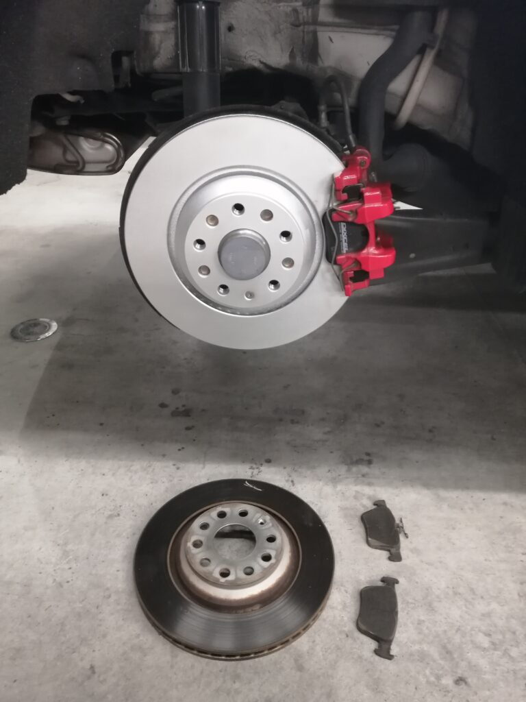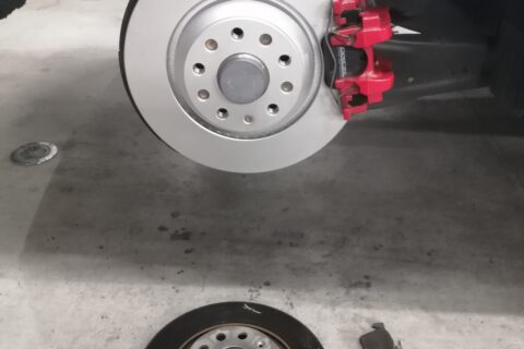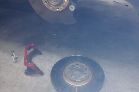 フロントブレーキローターの取り外し、清掃作業の実施。